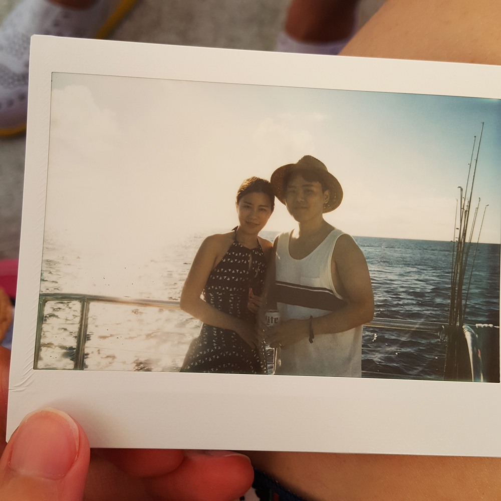 바다를 배경으로 폴라로이드 사진을 찍어줬다.