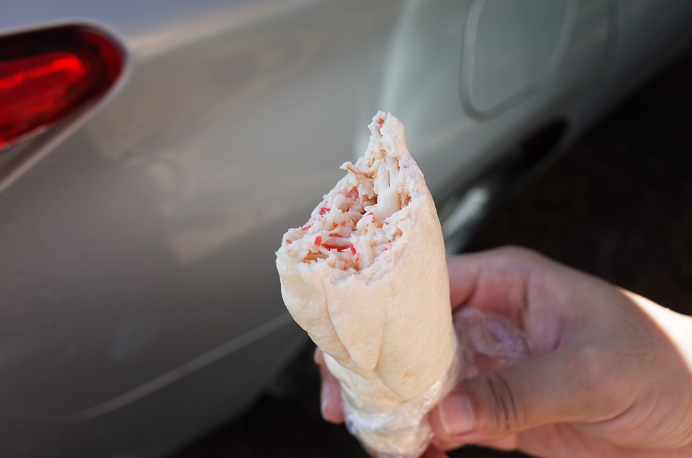 해변에 비치타올을 깔고 김밥과 이 맛살이 잔뜩 들어있는 빵을 뜯었는데