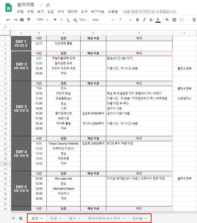 내가 발리여행을 준비하면서 작성한 구글 스프레드 시트!
