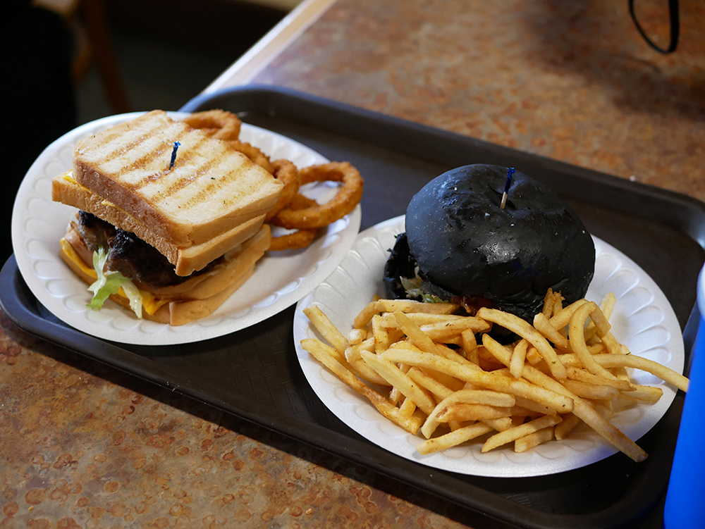 왼쪽에 그릴드 치즈 버거와 오른쪽 쉬림프 버거!